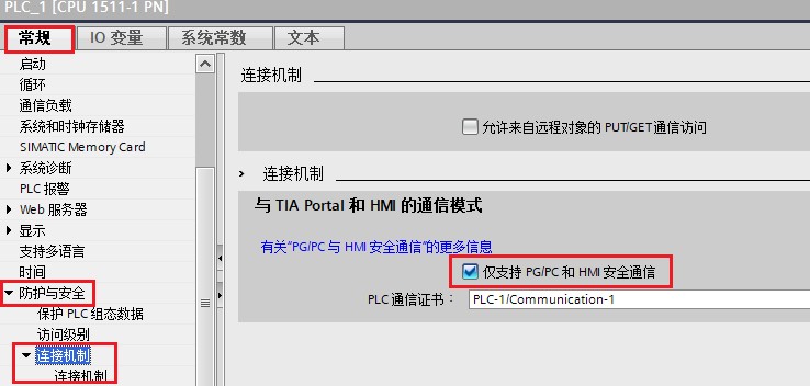 如果HMI的设备版本低于V17.0.0.0,PLC侧仍使用高版本的固件,需要在PLC侧取消“仅支持PG/PC和HMI的安全通信”才可以正常通信。