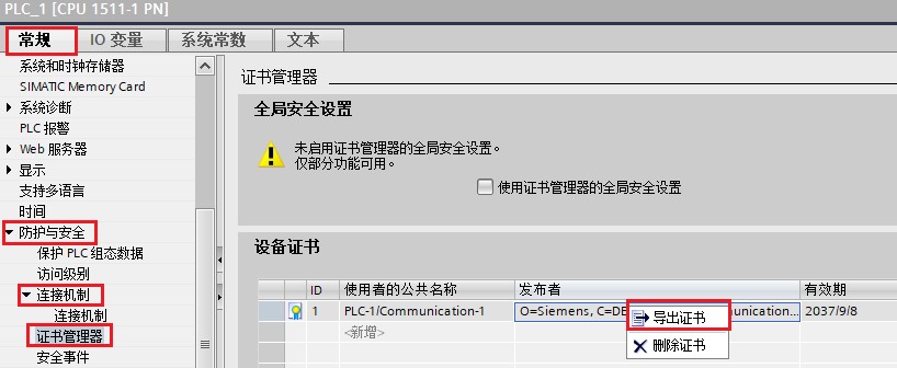 同时需要注意HMI设备的时间必须在PLC侧安全证书的有效时间之内。可以在“证书管理器”中查看证书,选择证书后点击鼠标右键导出证书。